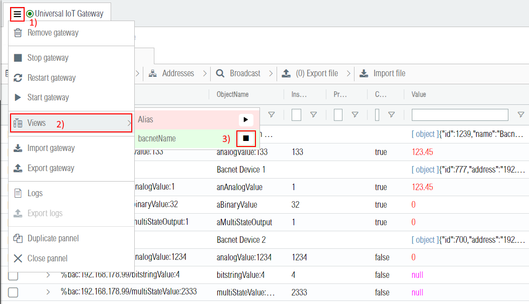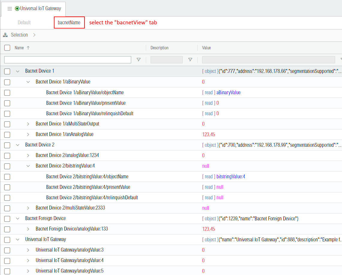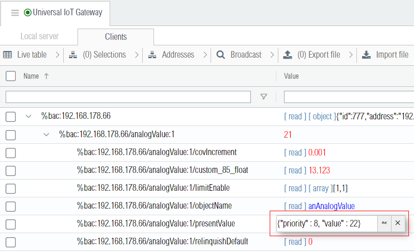 | Object value | objectValue | Determines wether bacnet object addresses hold only the presentValue property or a JSON object containing all properties. |