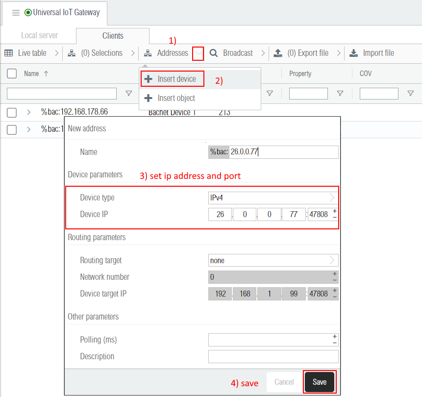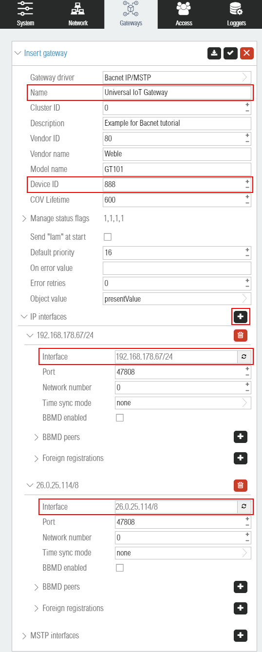 The first step is to insert the Bacnet IP/MSTP gateway. Each bacnet gateway is one bacnet device, and the bacnet device can interact on multiple IP and/or MSTP interfaces. Here we setup the bacnet device name to Universal IoT Gateway and the bacnet device id to 888. By clicking on the highlighted + button, multiple IP interfaces can be added. Here 2 interfaces are used, one on 192.168.178.67/24 the LAN (note that here the /24 netmask must be correct because the bacnet protocol uses multicast packets for device discovery), and 26.0.25.114 for the VPN interface.