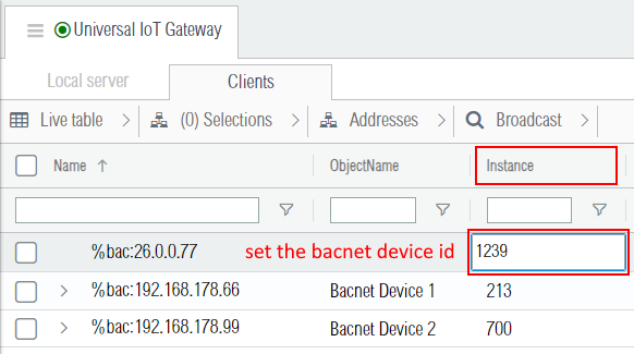 After the insertion, the driver tries to get the bacnet device id by sending unicast bacnet requests. If the bacnet device id cannot be retrieved automatically, it may be necessary to define it manually. To do so, the Instance column can be edited as shown below. When the communication with the device works, the bacnet device name should appear.