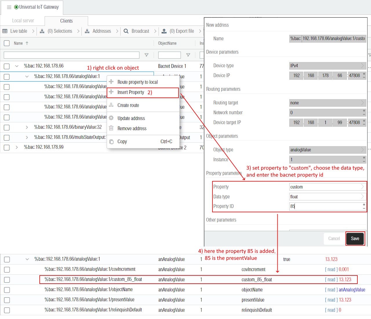 In bacnet clients devices, it is possible to insert custom properties by entering the property id and its datatype for encoding/decoding. The example below shows the insertion of one custom property with property id 85 (presentValue) and datatype float.