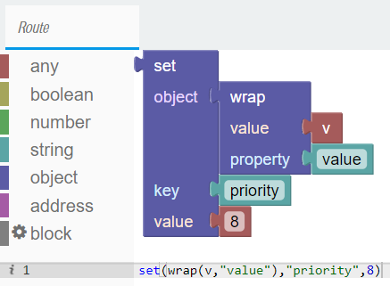 In order to write at another specific priority in a route, the source value transform function can be defined to wrap the value in an object and specify the priority. It can be done either using graphical blocks,