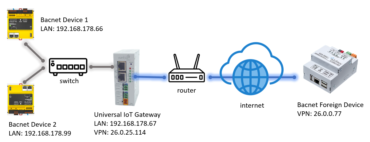 This tutorial showcases the configuration of the Bacnet IP on the Universal IoT Gateway. In the topology, there is 2 other bacnet devices on the local network area (LAN), and on the VPN interface one foreign bacnet device. In this example, it will be shown how to route a value from the foreign device (26.0.0.77) to one of the local devices (192.168.178.66).