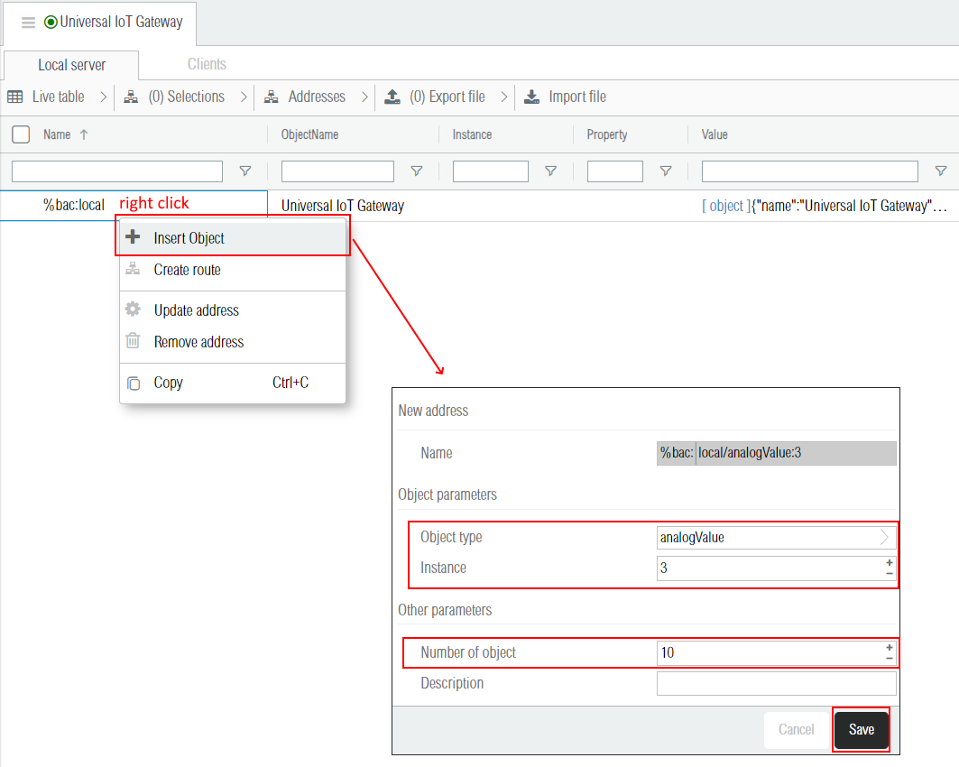 local as it can operate over multiple networks, while client devices are identifier either by the [ip address][:optional udp port] (the port is 47808 if omitted) for Bacnet IP and the MSTP mac address [0-254] for Bacnet MSTP. Note that if the client bacnet device is behind a bacnet router, the address of the device contains the routing addresses chain. Example of a chained address : %bac:192.168.1.2>2, where 192.168.1.2 is the bacnet ip to mstp router, and 2 is the final client MSTP mac address.analogValue, binaryValue, ...) coupled with their instance number ranging from 0, 1, 2, ... up to 4194302. Example : multistateValue:44.presentValue, objectName, description, etc...The table below shows examples of addresses of different types