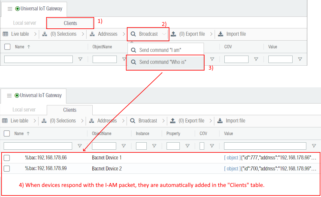 In order to discover devices on the same network, the bacnet broadcasts a who-is packet on all its interfaces. Note that in this example, the multicast works only on the LAN interface and is blocked on the VPN interface. Once the who-is packet is sent, bacnet devices receiving it will reply by broadcasting the bacnet i-am packet, which contains the bacnet identifier (integer), the vendor identifier (integer), and technical information regarding the supported packets segmentation methods and their maximum length.