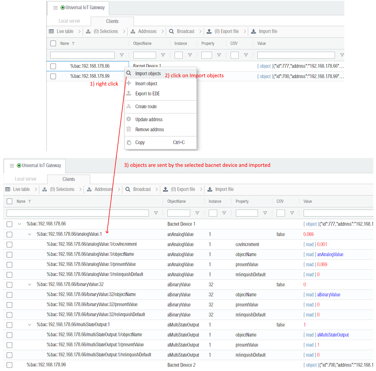 Each bacnet device has one special object of type Device whose instance is the bacnet device id. That device object contains many information about the device such as its name and its supported bacnet services / features. One of these properties is the bacnet device objectList. This property is particulary useful because it contains the list of all the objects present on that device. By reading this property, it is possible to browse the device, e.g. to retrieve the list and import all its bacnet objects. In the web interface objects are imported by right-clicking on the device and then in the context menu by clicking on "Import objects" as shown in the screenshot below. Once the list of objects is received, the corresponding object addresses are inserted along with their bacnet properties.