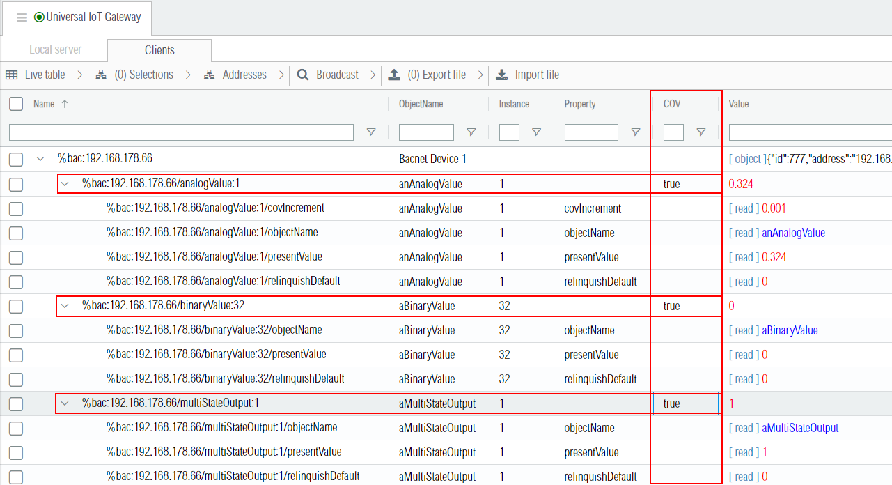 In this tutorial the local bacnet device on 192.168.178.67 acts as a data client and subscribe to an object for COV (Change Of Value) reporting. The target device, here 192.168.178.66, monitors the present value of the object property and checks the subscription list and the change criteria. When the change criteria are met the target device sends notifications of the new value to the subscriber(s) (here 192.168.178.67). As shown in the screenshot below, each object has a COV column which can be set to true to subscribe to the object change of value.