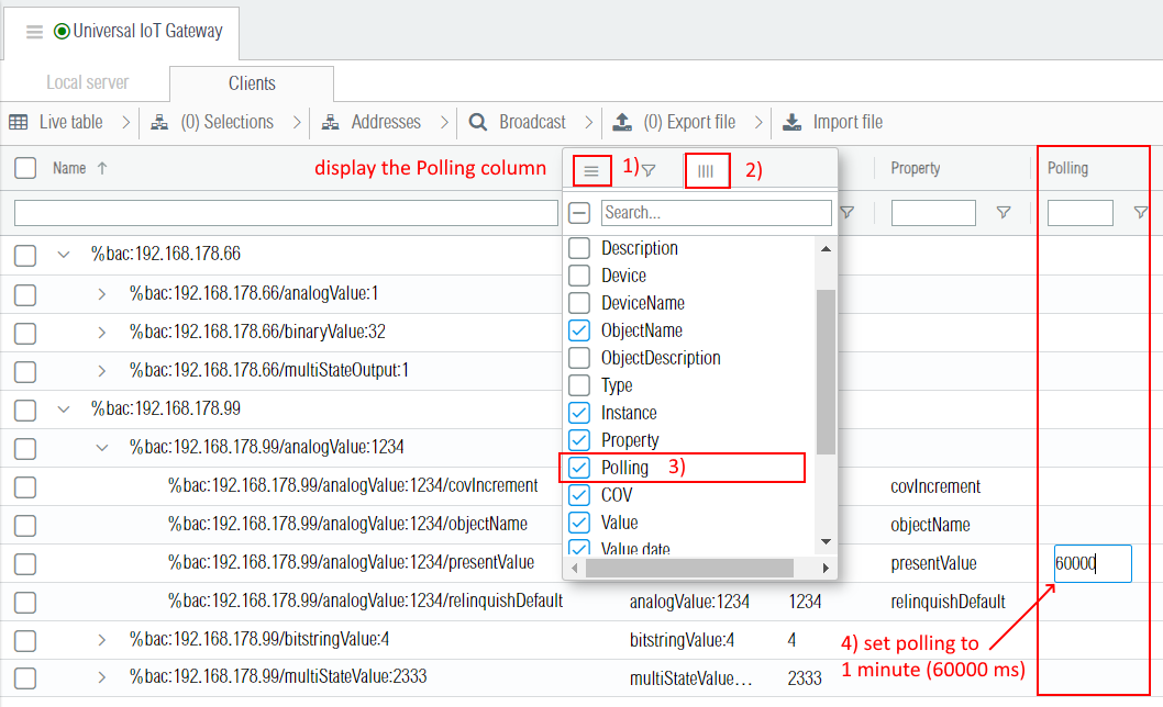 As not all devices support COV subscriptions, it is sometimes needed to poll bacnet objects. Each bacnet object property can be polled independently, but usually only the presentValue is polled. The polling is configured in the Polling column. That column is hidden by default and need to be displayed in the table. In this tutorial, the bacnet device with ip address 192.168.178.99 is polled every minutes to update its present values as shown in the screenshot below. Note that the polling should be used as sparsely as possible because it can cause traffic congestion, especially when using bacnet MSTP.