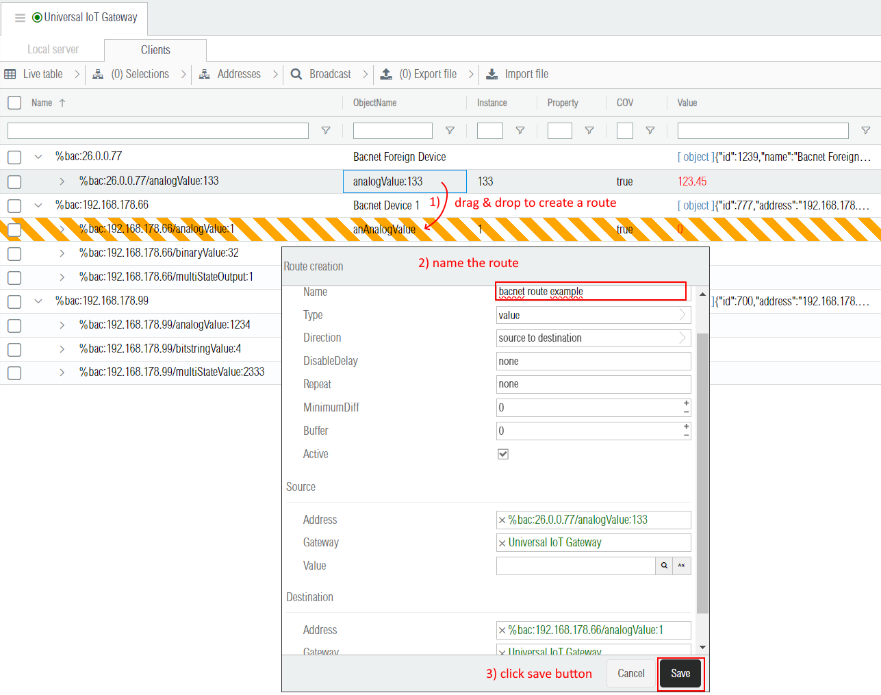 In this example we create a route between the source address %bac:26.0.0.77/analogValue:133 and the destination address %bac:192.168.178.66/analogValue:1. Note that in this case only the object values are routed, but for other use cases it is also possible to route the other object properties.