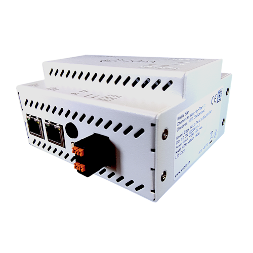 A dual-Ethernet model with two RS485 ports. The two Ethernet interfaces make it suitable for multi-network deployments — one port on the building LAN, the other on the field-bus network or a management VLAN.